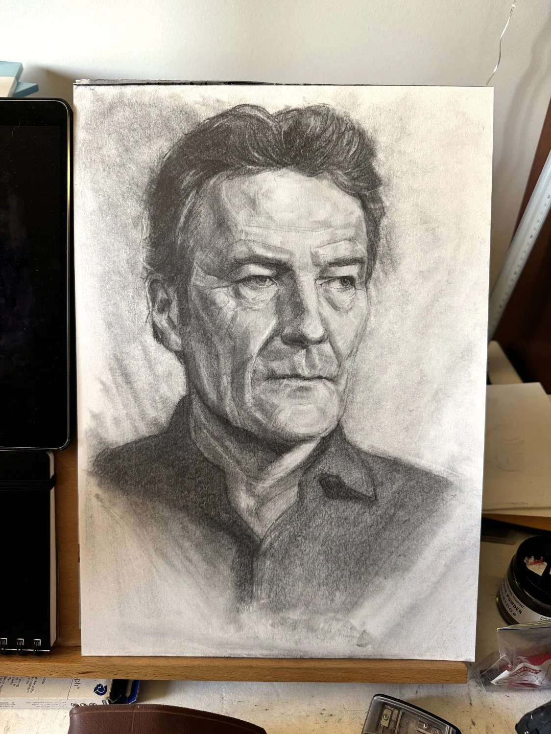 I needed to set myself up for success. Even though I’d done my submission with charcoal, I just couldn’t get it down to a four-hour process that would deliver an acceptable portrait. I’d recently splurged on some Blacking pencils and was enjoying working with them in my sketchbook, so I hatched a new plan: they’d be my medium, my Dumbo feather for the main event. Out with the charcoal, in with the graphite. I worked on some more practice portraits and felt much more satisfied with the results.