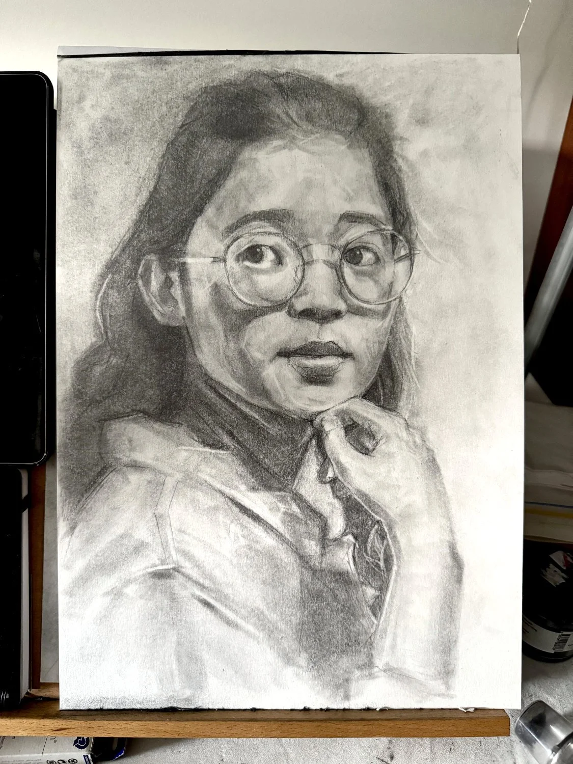 The pressure was getting to me. I wasn’t happy with any of my charcoal pieces. They were amateurish, unrefined, with more things working against them than in their favour. Was this a huge mistake? Self-doubt set in: I was going to be on this show and deliver a chaotic smudgy mess in front of everyone.